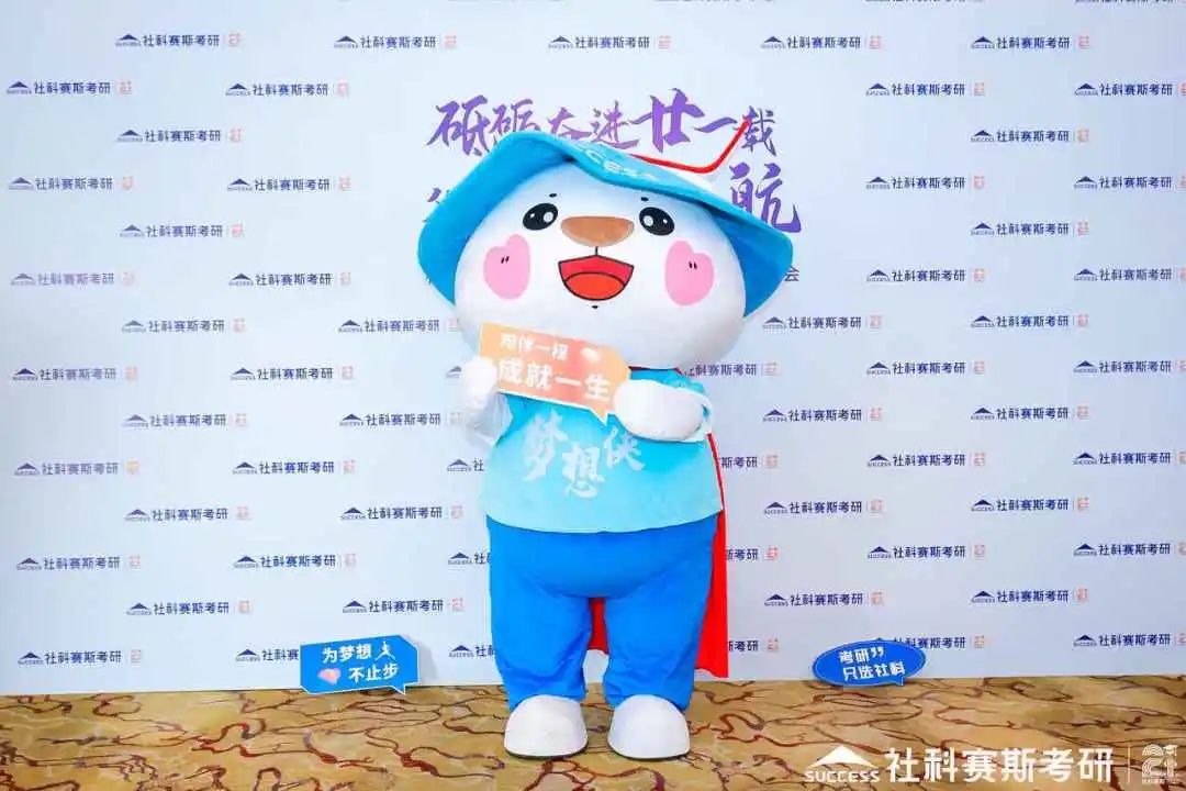 社科賽斯考研吉祥物夢想俠,也在本次大會上正式亮相,夢想俠以北極熊的形象為原型,注入俠客的創意靈感并進行設計創作。北極熊又名白熊,憨態可掬,象征溫暖、勇氣、力量,可以翻山越嶺登頂雪山高峰;顏色上面選取藍色系,藍色代表冷靜、理智、和諧、友誼,是夢想和希望的顏色,也是社科賽斯的品牌色;形態上面搭配俠客的帽子和披風,展現無所畏懼、為夢想勇往直前的俠客精神,將守護所有考研人最真摯的夢想。