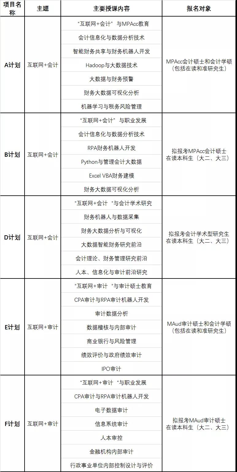 2020“互聯(lián)網(wǎng)+會(huì)計(jì)/審計(jì)”空中夏令營設(shè)置A、B、D、E、F計(jì)劃,面向全國在讀本科生和研究生開放申請。